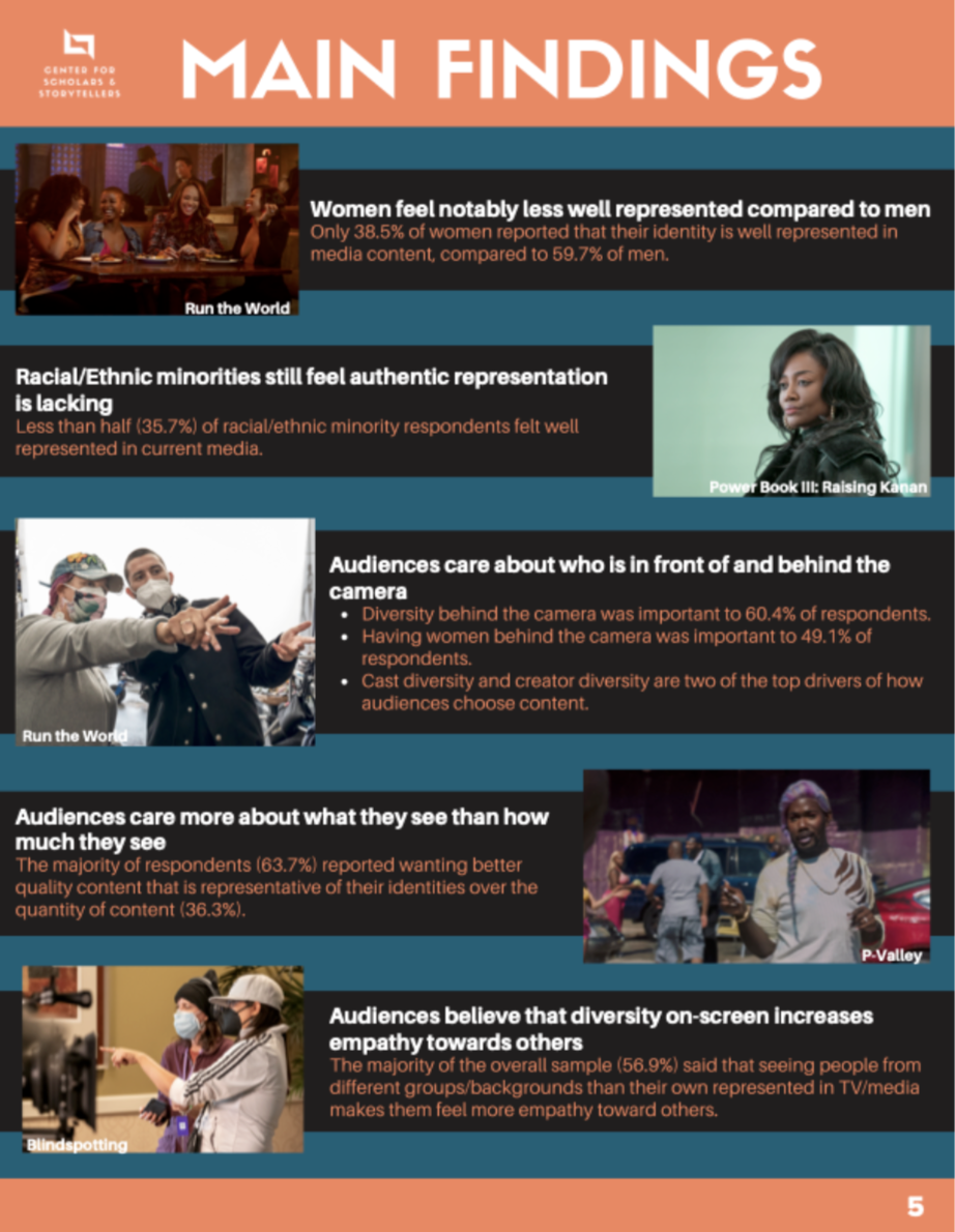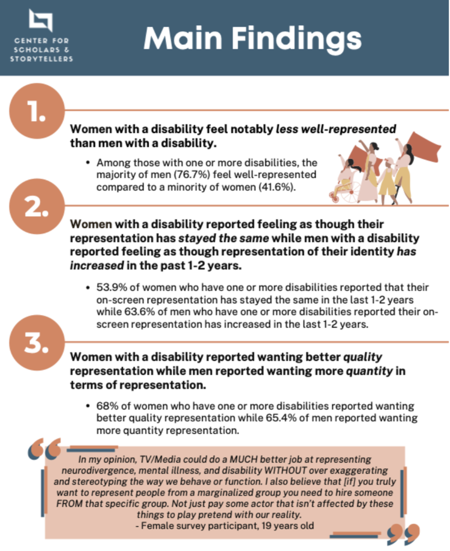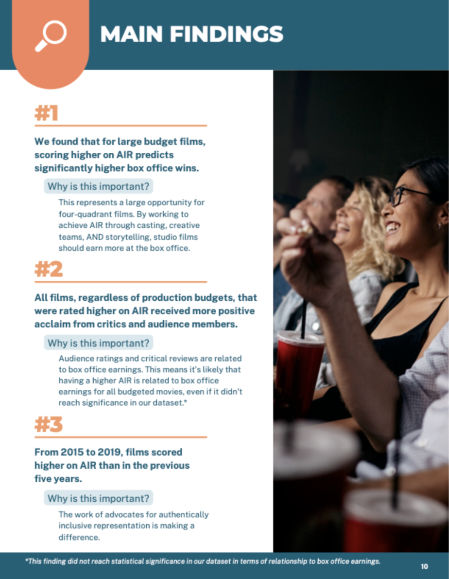 Beginning with the AIR Report, our research demonstrates that authentically inclusive representation tangibly impacts the bottom line. Building upon this, we surveyed general audiences in the US and abroad to better understand the viewing habits and attitudes of these groups when it comes to authentically inclusive representation, including that of disabled characters. This research has been widely covered in Variety, Deadline, The Hollywood Reporter, and IndieWire. Storytellers can draw upon these findings when making a case for why authentically inclusive representation is essential in storytelling for mainstream audiences. We have also linked to relevant reports from other organizations for your consideration.